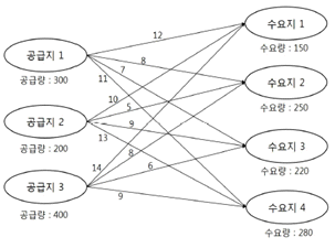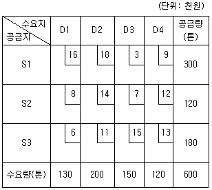 60. 다음 수송표에서 최소비용법과 보겔추정법을 적용하여 총 운송비용을 구할 때 각각의 방식에 따라 산출된 총 운송비용의 차이는? (단, 공급지에서 수요지까지의 톤당 운송비는 각 셀의 우측상단에 표시되어 있음)