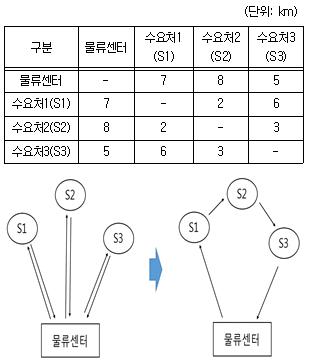 66. 각 지점 간 거리를 나타내는 거리행렬이 다음과 같을 때, 물류센터에서 3개의 수요처까지 개별 왕복운송하는 방법에서 순회운송하는 방법으로 변경할 경우 감소되는 운송거리(km)는?