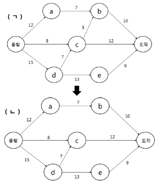 68. 출발지에서 도착지까지 유류를 운송하는 파이프라인에서 c → b 구간의 폐쇄를 고려하고 있다. 각각의 파이프라인 (ㄱ), (ㄴ)에서 운송 가능한 최대 유량은? (단, 링크의 숫자는 인접한 노드 간의 용량을 나타내며, 화살표 방향으로만 이동 가능함)