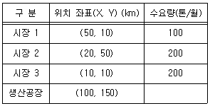 6. 시장 및 생산공장의 위치와 수요량이 아래 표와 같다. 무게중심법에 따라 출된 유통센터의 입지 좌표(X, Y)는?