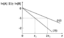 20. 그림은 반응 (가) A → X와 반응 (나) B → 2 Y의 반응 시간 에 따른 ln [A] 또는 ln [B]를 나타낸 것이다.