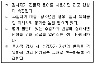 62. 심리검사 시행 시 고려사항으로 옳은 것을 모두 고른 것은?