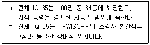 65. 중학교 2학년 A는 K-WISC-Ⅴ에서 전체 IQ가 85로 나타났다. 이 결과에 관한 설명으로 옳은 것을 모두 고른 것은?