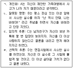 95. 벡(A. Beck)의 인지왜곡(cognitive distortion)에 관한 개념과 그 예로 옳은 것을 모두 고른 것은?