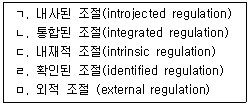 4. 라이언과 데시(Ryan & Deci)가 설명한 자기결정성 정도에 따른 자기조절 유형 수준을 낮은 것에서 높은 순으로 바르게 나열한 것은?