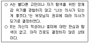 43. 마샤(J. Marcia)의 정체감 지위이론에 근거하여, 청소년 A와 청소년 B의 자아정체감 유형을 옳게 나열한 것은?