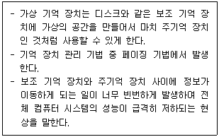 1. 다음은 운영체제의 기억 장치 관리 기법에서 나타나는 특정 현상에 대한 설명이다. 이 현상으로 옳은 것은?