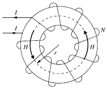" 가 정답이다.9. 그림과 같은 환상 솔레노이드 내의 철심 중심에서의 자계의 세기 H[AT/m]는? (단, 환상 철심의 평균 반지름은 r[m], 코일의 권수는 N회, 코일에 흐르는 전류는 I[A]이다.)