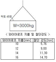 46. 3000kg의 질량을 가진 물체를 45도 각도로 그림과 같이 와이어로프가 직접 들어올릴 때, 안전율이 고려된 가장 적절한 와이어로프 지름을 표에서 구하면? (단, 안전율은 산업안전기준에 관한 규칙을 따른다.)