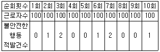 8. [표]는 A작업장을 하루 10회 순회하면서 적발된 불안전한 행동건수이다. A작업장의 1일 불안전한 행동률은 약 얼마인가?