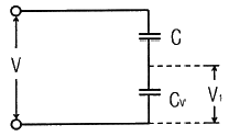 80. 정전용량 CV인 정전형 전압계에 용량 C인 콘덴서를 직렬로 연결하고 전압을 측정하여 V1의 지시를 읽었다. 입력 전압의 크게 V는?