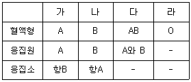 19. 혈액형에 따른 응집원과 응집소를 나타낸 것으로 응집소가 잘못된 것은?
