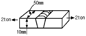 21. 두께 10mm, 폭 50mm인 강판을 그림과 같이 맞대기 이음하여 인장하중 2ton을 가했을 때 용접부에 생기는 인장응력은 몇 kgf/mm2 인가?