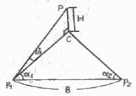 28. 그림과 같이 △P1P2C는 동일 평면상에서 α1=62˚ 8´, α2=56˚ 27´, B=95.00m 이고 연직각 ν1=20˚ 46´ 일 때 C로부터 P까지의 높이 H는?