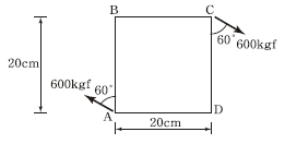 6. 600kgf의 힘이 그림과 같이 A와 C의 모서리에 작용하고 있다. 이 두 힘에 의해서 발생하는 모멘트는?