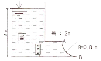 33. 그림과 같이 반지름이 0.8m 이고 폭이 2m인 곡면 AB가 수문으로 이용된다. 물에 의한 힘의 수평성분의 크기는 약 몇 kN 인가?