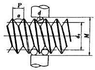 96. 그림과 같이 삼침을 이용하여 미터나사의 유효지름(d2)를구하고자 한다. 올바른 식은? (단, P : 나사의 피치, d : 삼침의 지름, M : 삼침을 넣고 마이크로미터로 측정한 치수)