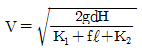 42. 수면의 높이 차이가 H인 두 저수지 사이에 지름 d, 길이 ℓ인 관로가 연결되어 있을 때 관로에서의 평균 유속(V)을 나타내는 식은? (단, f는 관마찰계수이고, g는 중력가속도이며, K1, K2는 관입구와 출구에서 부차적 손실계수이다.)