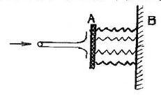 52. 스프링 상수가 10N/cm 인 4개의 스프링으로 평판 A를 벽 B에 그림과 같이 장착하였다. 유량 0.01m3/s, 속도 10m/s인 물 제트가 평판 A의 중앙에 직각으로 충돌할 때, 평판과 벽 사이에서 줄어드는 거리는 약 몇 cm 인가?