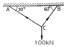 12. 그림과 같이 강선이 천정에 매달려 100kN의 무게를 지탱하고 있을 때, AC 강선이 받고 있는 힘은 약 몇 kN 인가?
