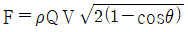 54. 그림과 같이 속도 V인 유체가 곡면에 부딪혀 θ의 각도로 유동방향이 바뀌어 같은 속도로 분출된다. 이때 유체가 곡면에 가하는 힘의 크기를 θ에 대한 함수로 옳게 나타낸 것은? (단, 유동단면적은 일정하고, θ의 각도는 0° ≤ θ ≤ 180° 이내에 있다고 가정한다. 또한 Q는 체적 유량, ρ는 유체밀도이다.)