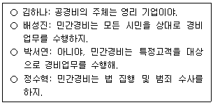 45. 민간경비와 공경비의 관계에 관한 다음 대화 중 옳은 설명을 한 사람은?