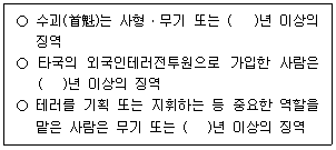 40. 국민보호와 공공안전을 위한 테러방지법상 테러단체를 구성하거나 구성원으로 가입한 사람의 처벌과 관련하여 ( )에 들어갈 숫자의 합은?