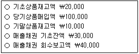 17. (주)한국은 상품을 신용에 의해서만 판매하는데, 경리담당자가 판매대금의 회수 과정에서 공금을 횡령하였다. 매출채권의 실제 기말잔액은 ₩50,000이고, 기중에 대손처리된 금액은 없다. (주)한국이 매출원가에 20%를 가산하여 판매가를 결정한다고 할 때, 다음 자료를 이용하여 경리담당자의 횡령액을 계산하면?