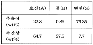 62. 초산 발효에 의해 생성된 초산-물의 혼합액을 벤젠을 이용하여 추출하고자 한다. 추출상과 추잔상에서의 초산, 물, 벤젠의 wt%가 각각 아래와 같다. 초산에 대한 벤젠의 선택도는?