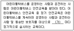 12. 「도로교통법」상 어린이통학버스 운영자 등에 대한 안전교육 중 <보기>의 (가)에 들어갈 말로 가장 옳은 것은?