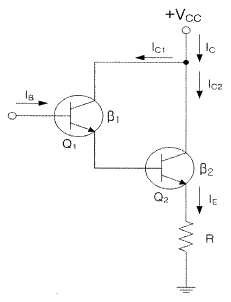 20. 다음의 달링턴 회로에서 직류 바이어스 전류 IE를 계산하면 약 얼마인가? (단, IB=2.56[μA], β1=100, β2=100 이다.)