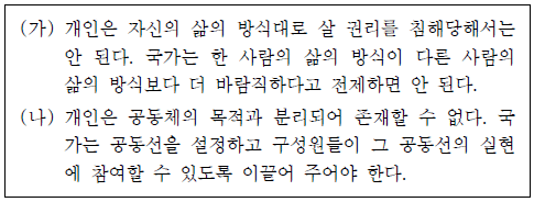 5. (가), (나)는 사회사상이다. (가)에 비해 (나)의 입장에서 강조할 내용으로 가장 적절한 것은?