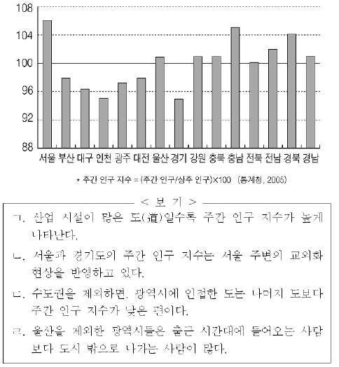 10. 자료는 시도별 주간 인구 지수를 나타낸 것이다. 자료를 옳게 해석한 내용을 <보기>에서 모두 고른 것은? [3점]