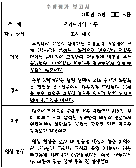 20. 자료는 학생들이 우리나라 기후에 관해 작성한 보고서의 일부이다. (ㄱ)~(ㄹ)중 알맞은 내용을 고른 것은?[3점]