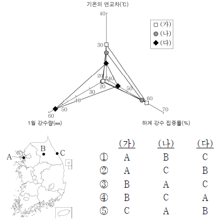 3. 다음 자료의 (가)~(다)에 해당하는 지역을 지도의 A ~ C에서 고른 것은? [3점]