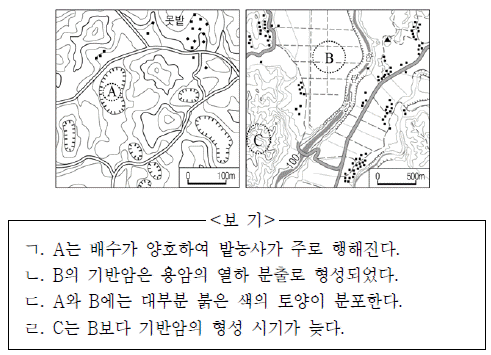18. 지도의 A~C에 대한 옳은 설명을 <보기>에서 고른 것은?