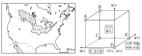 15. 지도의 (나)와 비교한 (가) 농업 지역의 상대적 특징을 그래프에서 고른 것은? [3점]