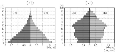 3. 그래프는 (가), (나) 국가의 연령별 인구 구조를 나타낸 것이다. 이에 대한 설명으로 옳은 것은?