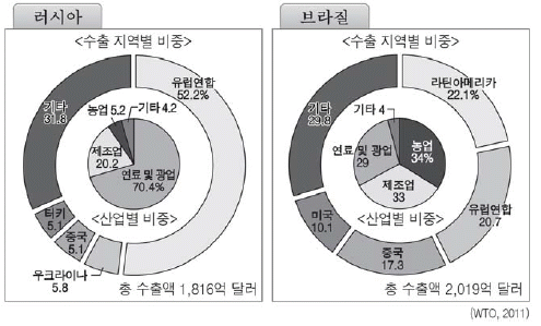 5. 그래프는 두 국가의 수출 현황을 나타낸 것이다. 이에 대한 분석으로 옳지 않은 것은?