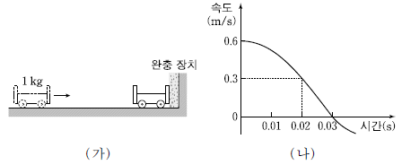 6. 그림 (가)는 마찰이 없는 수평면 위에서 질량 1kg인 수레가 완충 장치가 있는 벽을 향해 운동하다가 충돌하는 것을 나타낸 것이다. 그림 (나)는 수레가 충돌하는 순간부터 수레의 속도를 시간에 따라 나타낸 것이다. 수레는 충돌하는 동안 동일 직선상에서 운동한다.
