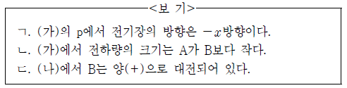 7. 그림 (가)는 x축 상에서 양(+)으로 대전된 도체구 A와 전하량을 알 수 없는 대전된 도체구 B가 각각 고정되어 있는 모습을 나타낸 것이다. 그림 (나)는 (가)의 A와 B를 접촉시킨 후 다시 원래의 위치에 고정시켜 놓은 모습을 나타낸 것으로, A는 음(-)으로 대전되어 있다. x축 상의 p점은 A와 B로부터 거리가 같은 지점이다.