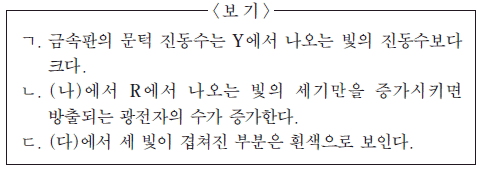 13. 그림 (가)는 광전관의 금속판에 노란색 발광 다이오드(LED)Y를 비추는 것을, (나)는 빨간색 발광 다이오드 R와 초록색 발광 다이오드 G를 (가)와 동일한 광전관의 금속판에 비추는 것을 나타낸 것이다. (가)에서는 광전자가 방출되지 않았지만 (나)에서는 광전자가 방출되었다. 그림 (다)는 흰 종이에 Y, R, G를 동시에 비추는 것을 나타낸 것이다.