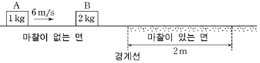 18. 그림은 마찰이 없는 수평면 위에서 물체 A가 정지해 있는 물체 B를 향해 6m/s의 속력으로 운동하는 것을 나타낸 것이다. A와 B가 정면 충돌한후, B는 마찰이 없는 면에서 운동하다가 마찰이 있는 면으로 들어간다. B는 경계선을 지난 순간부터 1초 후 경계선으로부터 2m 떨어진 지점을 통과한다. 마찰이 있는 면과 B사이의 운동마찰계수는 0.2이다.