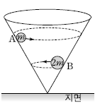 19. 그림은 질량 m인 물체 A, 질량 2m인 물체 B 가 지면에 대해 수직으로 세워진 원뿔의 마찰이 없는 안쪽 면에서 각각 등속 원운동을 하는 것을 나타낸 것이다. 역학적 에너지는 A가 B의 2 배이다.