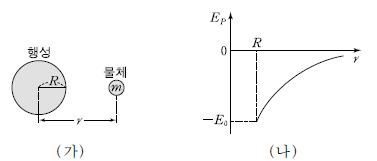 9. 그림 (가)는 반지름 R 인 행성과 질량 m인 물체가 거리 r 만큼 떨어져 있는 것을 나타낸 것이고, (나)는 r 에 따른 물체의 만유 인력에 의한 위치 에너지 Ep 를 나타낸 것이다.