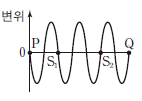 이 순간부터 1/4초가 지난 순간, P와 Q를 잇는 직선상에서 중첩된 수면파의 변위를 위치에 따라 나타낸 것으로 가장 적절한 것은?