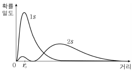 16. 그래프는 수소 원자의 1s, 2s오비탈에서 전자가 발견될 확률밀도를 원자핵으로부터의 거리에 따라 나타낸 것이다.