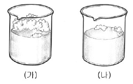 20. 두 개의 비커에 같은 양의 지하수를 넣고 각각 세탁비누와 LAS세제를 풀었더니, 그림과 같이 (가)에서는 거품이 많이 생겼고 (나)에서는 아주 적은 양의 거품이 생겼다.