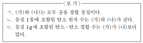 (가)~(다)의 공통점으로 옳은 것만을 <보기>에서 있는 대로 고른 것은? (단, H, C, O의 원자량은 각각 1, 12, 16 이다.)