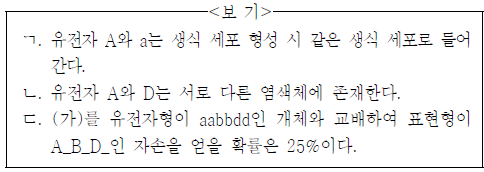 이에 대한 설명으로 옳은 것만을 <보기>에서 있는 대로 고른 것은? (단, 대립 유전자 A, B, D는 각각 대립 유전자 a, b, d에 대해 완전 우성이고, 교차와 돌연변이는 일어나지 않았다.) [3점]